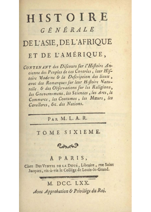 《亞洲、非洲與美洲通史——內含上述地區各民族之古代史論述、其近代史與地理描述,並附關於其博物誌、宗教、政體、科學、藝術、商業、習俗、風尚、民族性等之評述》,本書是18世紀歐洲啟蒙運動時期典型的百科全書式全球史著作的典範。由法國重農學派經濟學家、作家暨爭議人物魯博神父 所編纂,該系列巨著旨在為歐洲讀者提供一個關於歐洲以外世界的全面知識體系。
