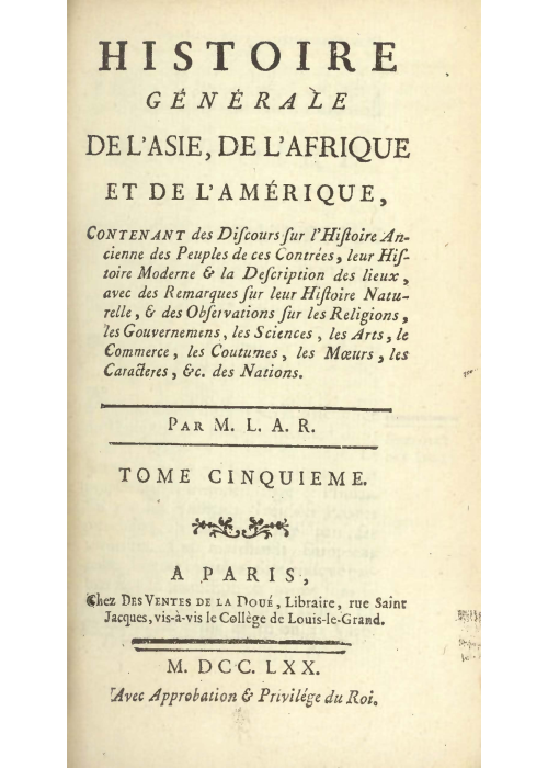 《亞洲、非洲與美洲通史——內含上述地區各民族之古代史論述、其近代史與地理描述,並附關於其博物誌、宗教、政體、科學、藝術、商業、習俗、風尚、民族性等之評述》,本書是18世紀歐洲啟蒙運動時期典型的百科全書式全球史著作的典範。由法國重農學派經濟學家、作家暨爭議人物魯博神父 所編纂,該系列巨著旨在為歐洲讀者提供一個關於歐洲以外世界的全面知識體系。