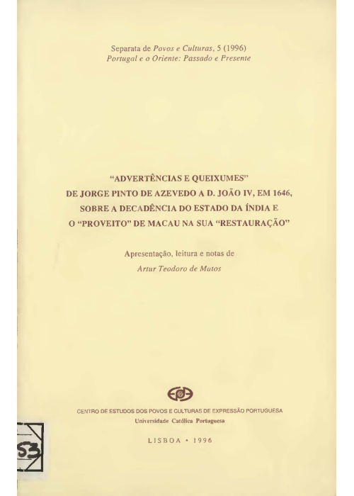 " Advertências" e "queixumes" de Jorge Pinto de Azevedo a D. João IV, em 1646, sobre a decadência do Estado da Índia e o "proveito" de Macau na sua "restauração"