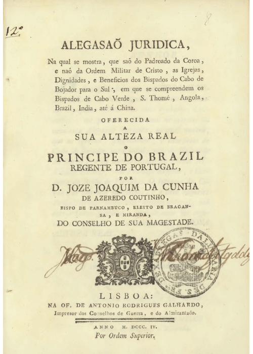 Alegasão jurídica na qual se mostra, que saõ do Padroado da Coroa, e naõ da Ordem Militar de Cristo, as Igrejas, Dignidades e Beneficios dos Bispados do Cabo de Bojador para o Sul, em que se compreendem os Bispados de Cabo Verde, S. Thomé, Angola, Brazil, India, até à China