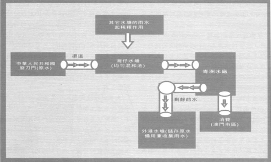 流入灣仔水塘的原水在輸送途中不斷得到其它水塘雨水的補充,以降低其含鹽量,進入澳門青洲水廠後,剩餘的水儲進兼具收集雨水功能的外港水塘。這個水塘在稀釋整體含鹽量和補充路環石排灣水塘方面起着舉足輕重的作用。澳門半島和兩個離島的飲用水流程見圖II和圖III。