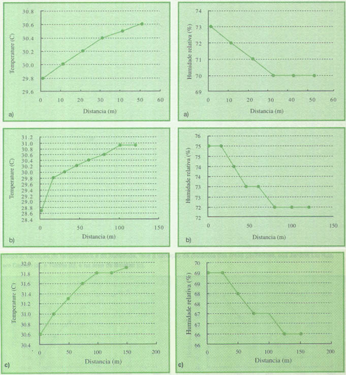 Mapa 2. Variação da temperatura e da humidade, face à variação da distância das áreas periféricas, nos Jardins Liu Hua, em Cantão(a), e Tianhe(b), e na área de Baietan(c).
