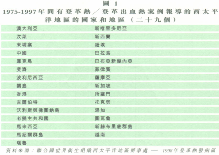 最近二十年來,該地區37個國家和地區中有29個已報導發現登革熱病例(圖1)。有將近15個國家和地區,如柬埔寨、中國、菲律賓、馬來西亞、老撾民主共和國、新加坡、越南及其他的太平洋地區及島嶼,每年都宣稱有此病流行(圖2)。近五年來報導的登革熱病例中,70%來自越南。