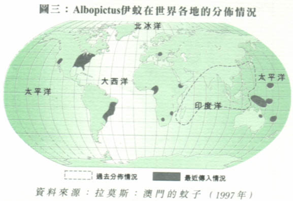 A.albopictus類伊蚊,首先在東方及印度-馬來西亞地區被碓立為一類,近30年來(圖3),經美洲、墨西哥、加勒比海、西太平洋、非洲及歐洲傳播至世界各地。