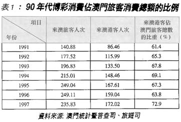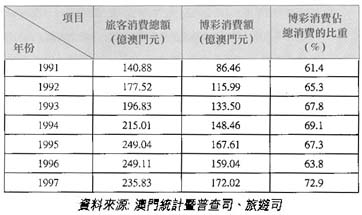 長期以來,旅遊博彩業一直在澳門經濟中佔有重要地位,除了80年代中的一段時期以外,它一直是澳門經濟中最大的產業支柱。據統計,1997年旅遊博彩業在澳門本地生產總值中所佔比重高達45%。旅遊博彩業包括博彩業、遊覽業、酒店業、飲食業、娛樂業、旅運業、珠寶首飾業、手信業以及古玩業等,其中,核心行業是博彩業。踏入90年代,博彩消費在來澳旅客消費額中所佔比重逐年上升,已從1991年的61%上升到1997年的73%(見表1)。