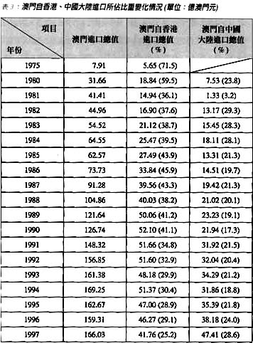 由於地域狹小、資源短缺,澳門出口加工業所需要的生產設備、原材料以及各種零配件等幾乎全部需要從外地進口。因此,澳門的進口物品中,生產設備、原材料、零配件及半成品所佔比重很高,一般在55%以上。然而,澳門當時沒有深水港和國際機場,對外聯繫主要依靠香港,這部份物品絕大部份是透過香港進口的。長期以來,香港一直是澳門最大進口來源地,70年代中出口加工業高速成長時,澳門自香港進口在澳門進口總值中所佔比重一度高達70%以上,到80年代初仍佔60%左右,其後10年徘徊在35-45%之間,1996年之前仍居澳門進口總值的首位(見表3)。