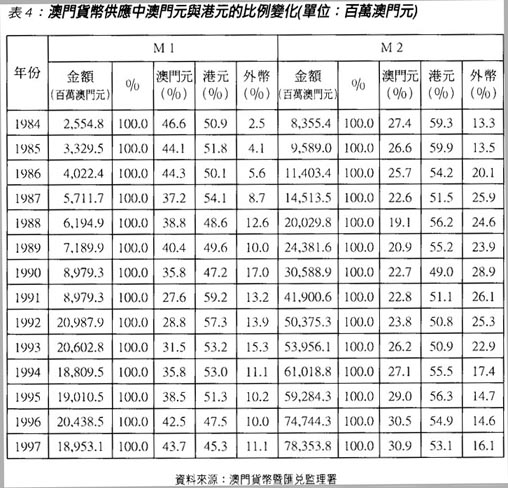 長期以來,港元一直是澳門最廣泛流通的貨幣。這種情況時至今日仍然沒有改變,它的流通量甚至超過澳門本幣——澳門元。這種特殊的現象可以從澳門貨幣流通量M1、M2中港元與澳門元的比重變化清晰可見。從80年代中期起,澳門元在M1(流通貨幣加上活期存款)中所佔比重從1984年的46.6%,下跌到1991年的276%,同期港元所佔比重則從50.9%上升到59.2%。不過,從1992年起,這種趨勢開始扭轉,但到1997年,澳門元在M1中所佔比重達43.7%,略低於港元的453%。在M2,澳門元的比重僅達309%,遠低於港元的531%(見表4)。目前,在澳門的大額交易和對外貿易支付中,港元的使用量大大超過澳門元;銀行存款中,亦是港幣存款佔主導地位,形成澳門經濟中獨特的通貨替代現象。因此,港元匯價的穩定與否,對澳門的金融體系以至整體經濟都具有極其重要的影響。