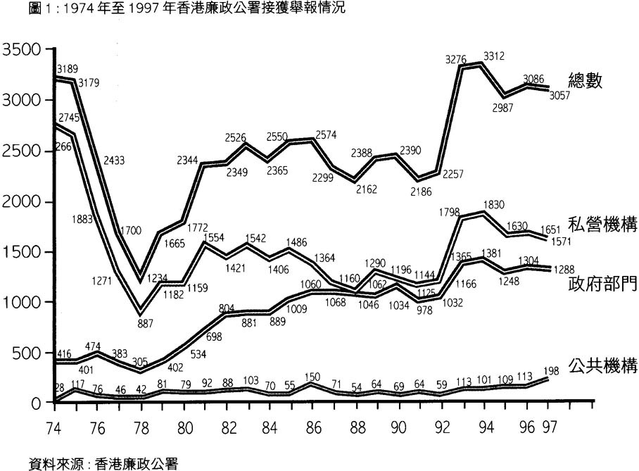 1974年2月,鑒于輿論的壓力,香港總督麥理浩頒佈法令,設立廉政公署(全稱是”總督特派廉政專員公署”,英文簡稱”ICAC”),致力反貪倡廉工作。該署成立後隨即採取連串行動,對政府公務員,尤其是警隊高官中的猖獗貪污行動展開嚴厲的打擊,先是通過英國警方拘捕潛逃在英的前警務處總警司、大貪污犯葛栢,將其引渡返港受審,判處入獄4年;繼而于1977年處理了尖沙咀警署集體貪污大案,從而迅速在香港社會和國際間建立了聲譽。香港廉政公署成立二十多年以來,其反貪倡廉工作,可說取得了有目共睹的成效。據統計從1974年至1997年間,香港廉政公署接獲的貪污舉報高達61,668宗,平均每年接獲舉報達2,569.5宗(圖1),該數字反映了社會各界對廉政公署的信任和支持。