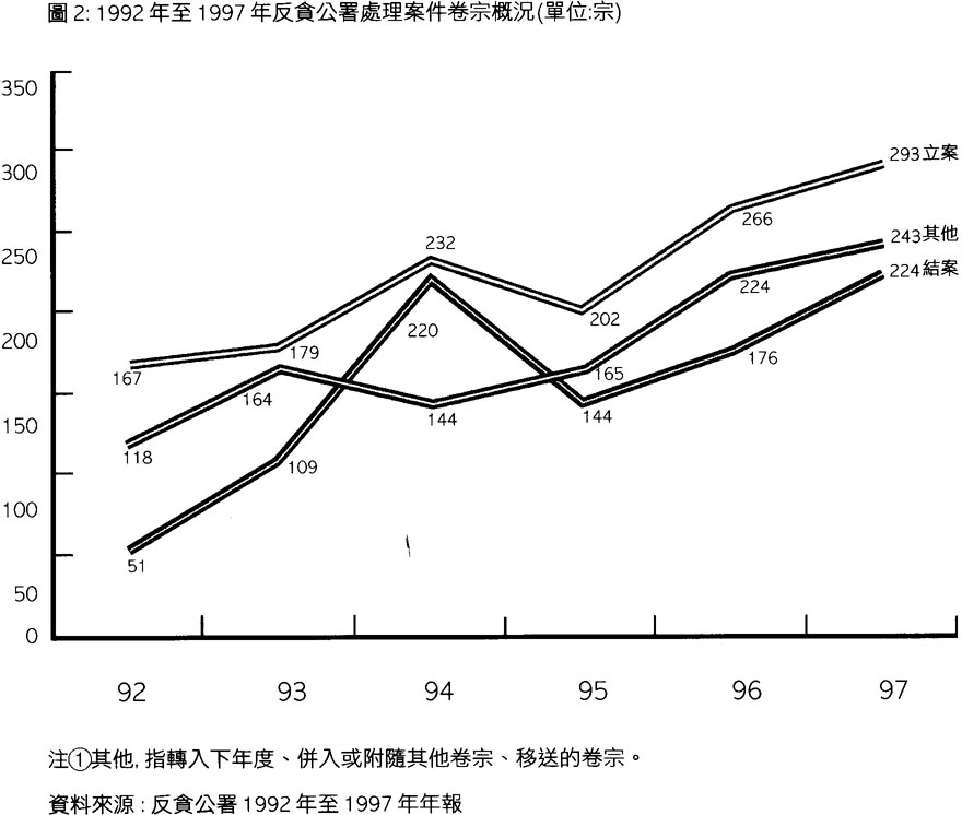 反貪公署的建立,無疑是澳門社會的一個進步。該署成立以來,實際上也取得了一定的成效。據統計,從1992年至1997年間,反貪公署共立案1,339宗,已結案924宗,平均每年分别為191宗和132宗(圖2)。