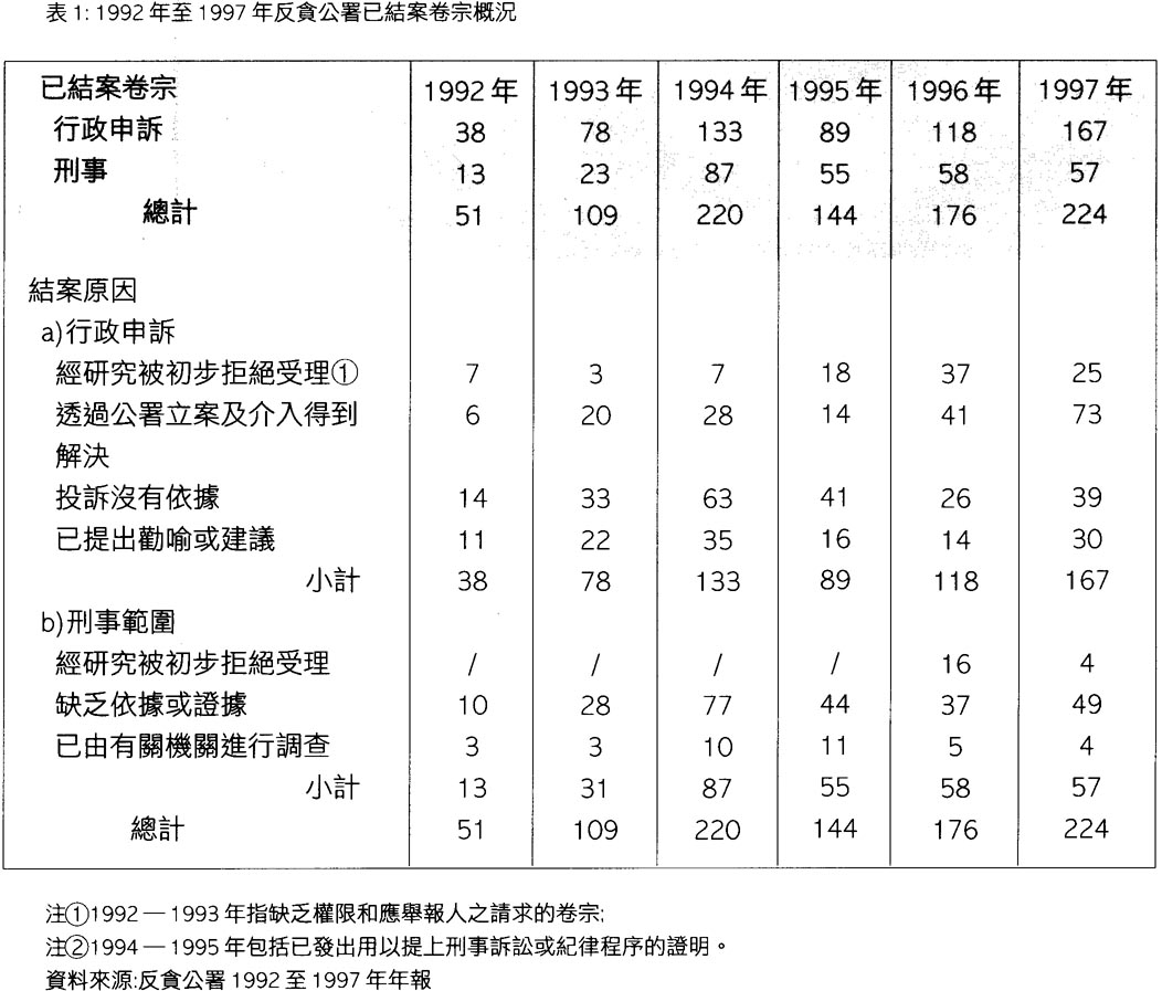 然而,反貪公署由于受到葡國憲法的限制及其他種種原因,明顯先天不足,其組織架構、人員編制及權限均受到很大的制約,因而實際成效有限。該署成立以來,政府架構中,尤其是某些紀律部隊中,貪污受賄之風仍然盛行,這已成公開的秘密。反貪公署因而被民間稱為“無牙老虎”,其工作重點亦頗側重于行政申訴方面,此類卷宗約佔全部已結案卷宗的三分之二強(表1)。