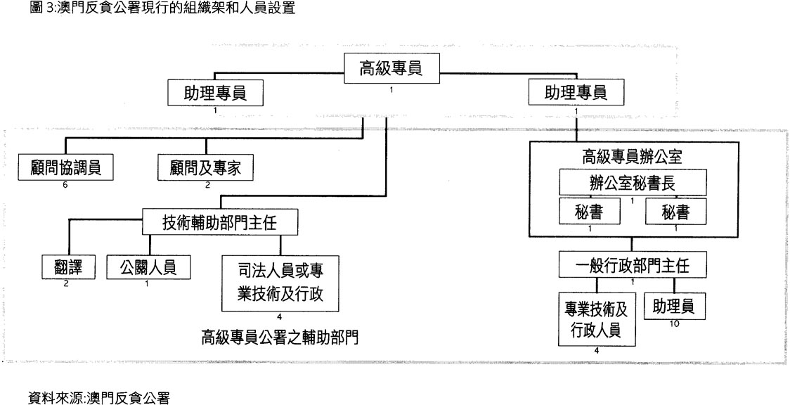 (4)廉政公署的架構維持不變,人員編制可適當擴大,從目前的約40人編制適當擴大到50至60人編制,擴編的職位應加強顧問、協調員、專員的力量,以便充分運用新法律賦予的權限,以回應社會的訴求。