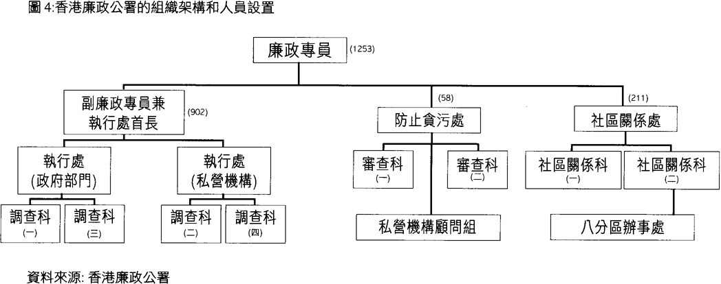 相比之下,香港的廉政公署明顯是一個專職調查的權力機構。廉政專員之下,分别轄有執行處、防止貪污處、社區關係處和行政總部。執行處首長由副廉政專員兼任,負責接獲舉報,對貪污事件作出調查。該處下設兩位執行處長,分别負責政府部門和私營部門兩方面的調查工作。執行處是廉署最大的部門,現有902個職位,占全署編制1,253個職位72%。防止貪污處負責審視政府部門及公共機構的制度,以便查察及減少貪污的機會,並因應私營機構及個人的要求,為其提供防貪顧問服務。該處下轄兩個審查科和一個私營機構顧問組,共設58個職位,職員主要是專業人才,包括前任和借調的公務員、電腦專家、測計師、土木工程師及會計師。社區關係處别致力推動社會各界支持反貪倡廉,下設2個社區關係科及8個分區辦事處,設有211個職位(圖4)。