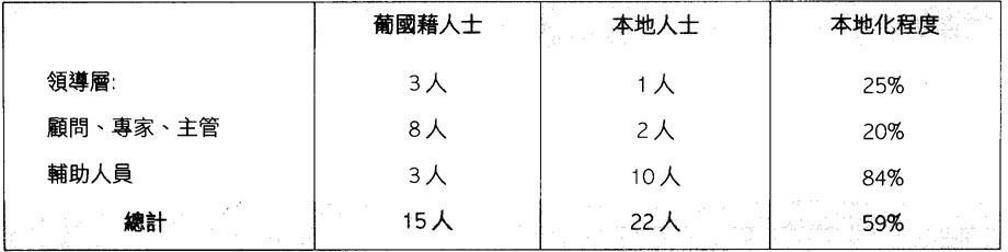 目前,反貪公署的人員過渡方面亦存在不少問題:①首先是現任高級公署專員裴明達屬葡藉,其任期到1999年11月28日,根據《基本法》的有關規定,裴明達不能過渡,因此特區廉政專員的人選是一個重要問題,特區首任廉政專員的提名必須符合《基本法》第50條第六項,第59條,第63條的具體規定,即作為主要官員,他必須由行政長官提名後,“報請中央人民政府任命”必須是“在澳門通常居住連續15年的澳門特别行政區永久性居民中的中國公民”,“就任時應向澳門特别行政區終審法院院長申報財產,記录在案”。②其次是公署高級職員的本地化程度頗低,領導層的本地化程度僅達25%,顧問、專家、主管級職員的本地化程度更低達20%(表2)。九九回歸前後,公署的葡藉顧問、專家可能有部分流失,人員短缺情況更形嚴重。