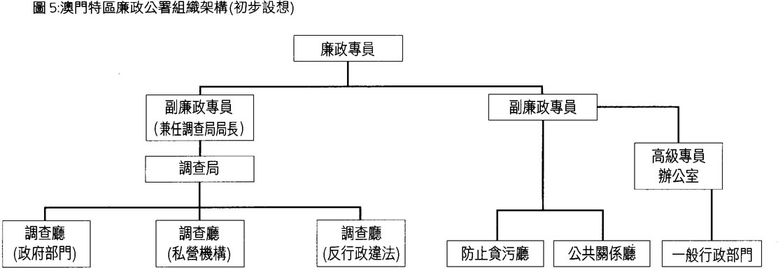 (4)廉政公署的編制應否擴大。從香港看,廉政公署的編制約1,200人,公務員隊伍約18萬人,城市人口約600多萬人,倘以這個比例衡量,澳門公務員隊伍約18萬人,是香港的十分之一,人口約40多萬人,是香港的十五分之一,廉政公署的編制可定在100人左右,但這只可作為一個參巧係數,而非絕對指標。