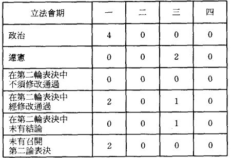 另一方面,澳督在第一屆立法會期內,對立法會所通過的草案,行使了四次政治否決,令草案返回立法會再作討論,結果其中兩個草案在第二輪表決中經修改獲通過,另外兩個草案則未有召開第二輪表決(見表3)。在其後的幾屆立法會期內,總督亦曾行使過兩次否決,其中一次後來獲修改通過。