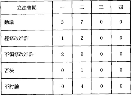此外,立法會對過去總督所頒佈的法令亦採取過多次追認程序,以作爲對總督權力的制衡。其中,在第一屆立法會動議三次追認要求,法令經修改準許爲一個,不須修改獲準許爲二個;而在第二屆立法會期內,立法會更七次動議對澳督所頒佈的法令進行追認,結果只有兩個法令經修改後獲準繼續生效,而一個遭到否決(表4)。而在此後的兩屆立法會期內,立法會再沒有對澳督的法令作追認動議。