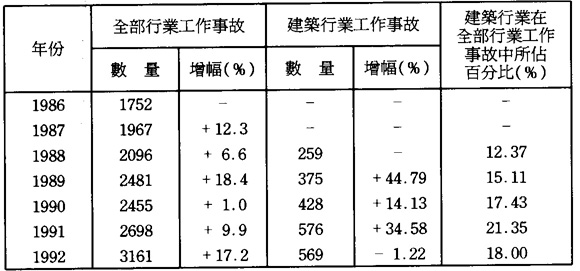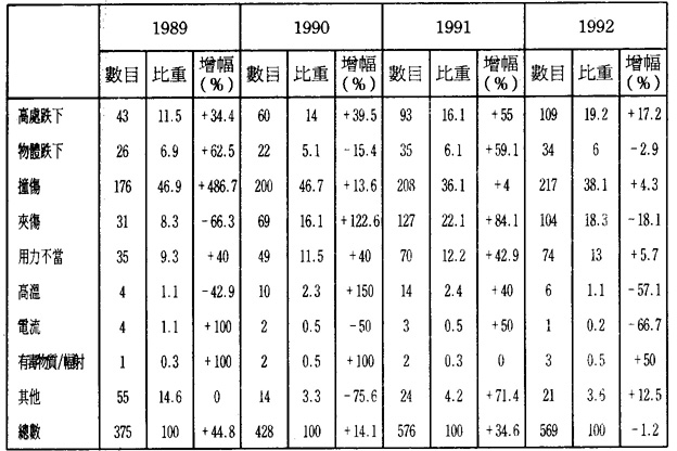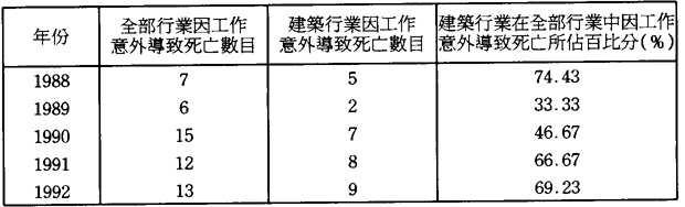 第一,根據1991年5月《就業調查》顯示,在全澳就業人口中,建築業只佔8.63%,①但因工作事故而引致死亡的人數卻遠超其它行業。例如,1992年在工作意外中不幸死亡的工人中建築行業竟佔69.23%(見表2)。