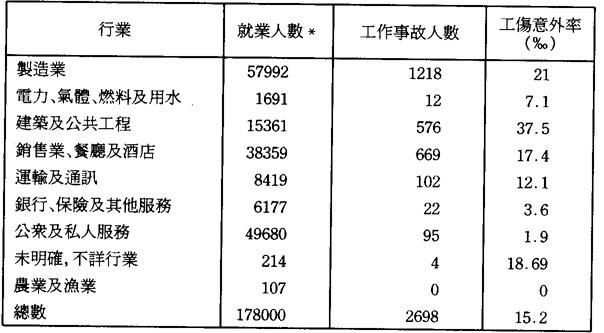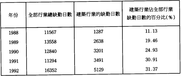 第二,建築行業是一個非常多變的行業。1992年全澳約有230多個建築地盤,其中大地盤約佔111個,②建築規模正不斷擴大。同時,在施工過程中,工人需要付出大量的勞動量和採用許多各式各樣的機械和器具。再者,工作的環境往往跟隨着工程的性質、進度而不斷轉變,令到工人身處的作業環境較爲惡劣,不安全的因素亦相對提高。所以做成建築行業的工作事故遠較其它行業爲高。以1991年爲例,建築行業的工傷意外率達37.5‰(見表3)。除制造業外,其幅度爲其它行業一倍以上。
