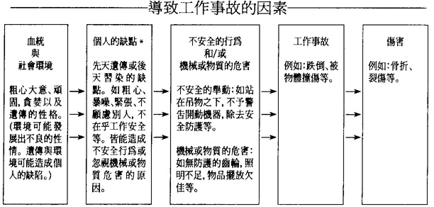 一般而言導致工作事故的原因可以劃分爲兩大類,即不安全的情況及不安全的行爲。前者涉及實際的環境,如工廠中機器的擺放、光線、溫度以及工作程序等等;後者多爲工人個人的因素,如智力、體力、經驗、性情等等。然而,究竟那方面是主因,則學者之間存在着不同的看法。韓笠奇(W.H.Heinrich)指出88%的工作事故是由於操作人員的不安全行爲所引致;⑧在1987年當時的國際勞工督察協會副主席尚佈蘭在一個講座上亦指出:“工業意外的產生,有80%是人爲或其它因素造成,其中包括員工本身對安全知識不足夠或者缺乏安全培訓”。⑨但是在賓夕法尼亞州1967 年的普查結果以及伊斯特曼(Eastman)的研究則認爲只有22%-26%的工作事故是全部或部份因工人而引起。⑩許多學者基於上述的爭論,不斷地進行研究,因而對於導致工作事故的原因提出了不同的理論。