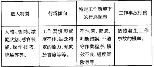 第二,個人特質理論,由麥克米科(Exnest McCormick)與蒂芬(Joseph Tiffin)所發展出的一種理論模式。(12)他們將個人特質和工作事故聯結在一起(見表5),認爲個人的個性、動機等特徵是人類行爲傾向的基礎,而行爲傾向正是導致工作時不安全舉動的主因。具有“意外傾向”的人,其發生工作事故的機率遠較其他人爲高。故此,必須對職位上的員工進行測試,觀察他們是否具有意外傾向,藉此減少工作事故的出現。