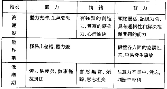 第三,生物鐘理論。所謂生物鐘是研究自然界各種生物機體內按照自己的特定的時間表和運動規律的理論。將這個理論最早應用於工業安全方面,可說是在本世紀初,由德國內科醫生威爾赫姆·弗裏和奧地利心理學家赫爾曼·瓦斯波達首創。(13)他們發現人的體力和情緒分別存在一個23天和28天的周期變化。其後,奧地利的阿爾累·泰爾其教授亦發現人的智力以33天爲周期性的波動。(14)綜合上述的三種周期波動變化,將人的安全觸覺劃分爲三個階段(見表6)。處於高潮期的人具活力和創造性;處於低潮期的人的活動緩慢,易激動和猶疑不決;而處於高潮期和低潮期的過渡或轉移期間,稱爲臨界期。從安全的角度而言,臨界期對安全構成的威脅較之低潮期爲大,更須多加注意。