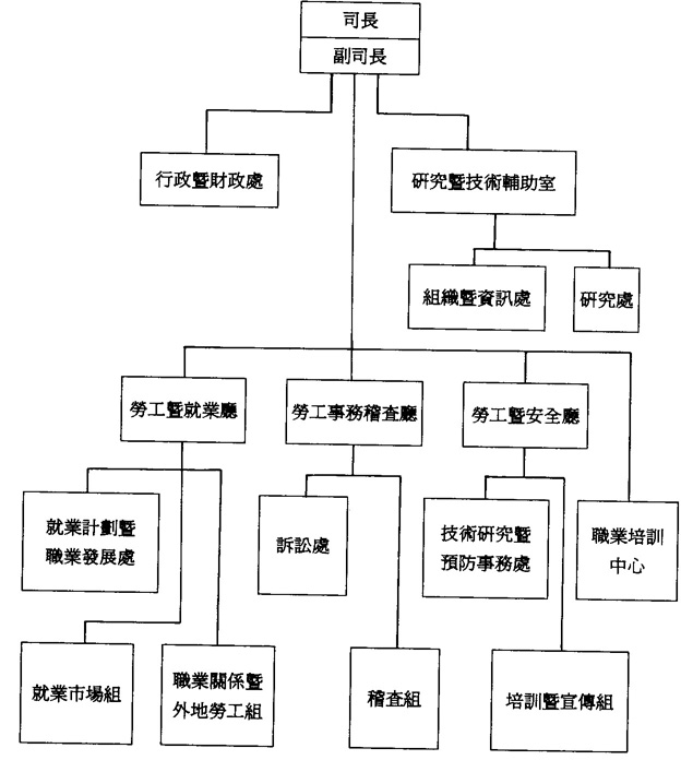 澳門勞工司成立於1984年,(29)屬於衛生暨社會事務政務司轄下的司級機構,其職權範圍涉及勞工方面的各個領域,例如:就業、培訓、建議、稽查和安全等。根據法令規定,在勞工司之內主要設有三個廳(見附圖1):勞工暨就業廳、勞工事務稽查廳和勞工暨安全廳。而涉及工業安全方面主要爲後兩個部門。勞工事務稽查廳的主要工作是在工作場所內,爲僱主及僱員提供有助於改善工作條件的安全及衛生方面的意見,並對違反有關法例規定的僱主作出教導、勸諭和起訴,其職權受到(30)《勞工稽查章程》所規限,而在該廳之下設有稽查組和訴訟處。至於勞工暨安全廳,下設有技術研究暨預防事務處和培訓暨宣傳組,前者負責對改善工人的安全與衛生條件進行研究、協助制訂法例,並對工人可能造成危害的事項進行實驗研究;後者則主要涉及對工人的宣傳和教育方面,主要透過舉辦不同形式的活動,如工業安全同樂日、安全講座等來推廣有關方面的訊息。