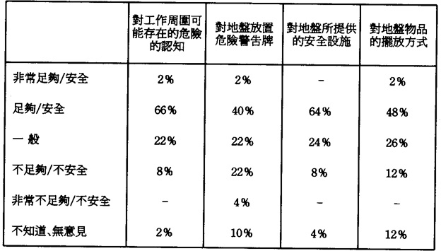 一個工人對於工業安全的看法會直接影響他在工作環境中的表現行爲。當有正確的看法時,僱主會對在工作場所內容易引發危險的因素採取一定的預防措施,而工人亦會樂意在工作過程中對自身和他人採取正確、積極的態度。因此當一個工人具有足夠的安全認知時、便能在一定程度上增加對意外事故的防範:從調查訪問中,筆者獲得以下的資料: