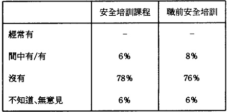 第四,對於由僱主所提供的安全培訓。根據現行的《建築安全與衛生章程》,僱主有義務爲員工提供安全訓練。然而調查顯示,有八成上的工人未曾參與過由公司所舉辦的安全培訓課程,包括在職前訓練(見表13),而曾經參與的僱員大多數屬於較高技朮的職位,如起重機操作員、地盤經理等。