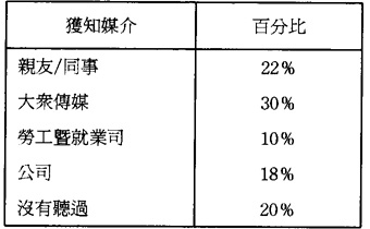 第六,有關工人對工業安全法例的認識。在被訪的工人中,有八成表示曾經聽過有關建築業方面的安全條例,但只有百分之二的員工表示知道有關法例的內容。而工人獲知法例的途徑,大多數是透過大衆傳媒(30%)和朋友、同事(22%)之間的傳播,僅有10%的工人表示是通過勞工司的渠道獲知有關的法例(見表14)。