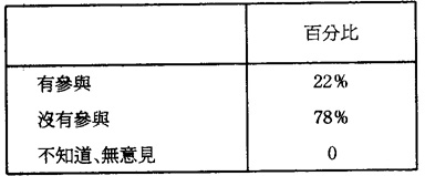 第七,對於由勞工司舉辦的工業安全活動。勞工司每年都投放大量的資金,人力等從事各式各樣的工業安全推廣和宣傳,例如,工業安全展覽會,到學校舉行工業安全講座等。然而,雖然有七成以上的工人表示有關的活動能夠幫助他們更加了解工作方面的安全問題(見表15),但卻發現有78%的被訪者實際上未曾參加過有關的活動(見表16),而部份曾參與的工人亦表示,他們參與的原因只是“適逢其會”之故。