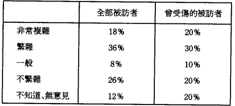 第三,曾受傷工人的特徵。曾受傷的工人(33)中有五成是從事雜工工作,且絕大部份爲男性,他們的教育程度有九成在初中以下,而年齡則介乎35到44歲之間(佔60%)。在調查中顯示這批人有七成不知這藥箱放在何處,而對於表12的看法,竟有近八成的工人表示滿意,由此可推知有關的工人實際上對工作周圍環境的安全狀況缺乏認識,他們表示滿意,其中最主要原因是全憑經驗而作出的看法。