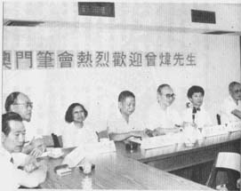 香港作家聯誼會赴澳訪問团一行二十多八,於八九年九月廿四日抵澳,上午十一時在澳門日報七樓會議室與澳門筆會成員舉行聯歡座談會。聯歡會上港澳作家,新知舊兩,濟濟一堂,談文論藝,互相介紹兩地近期的文藝創作及出版情況,氣氛熱烈。