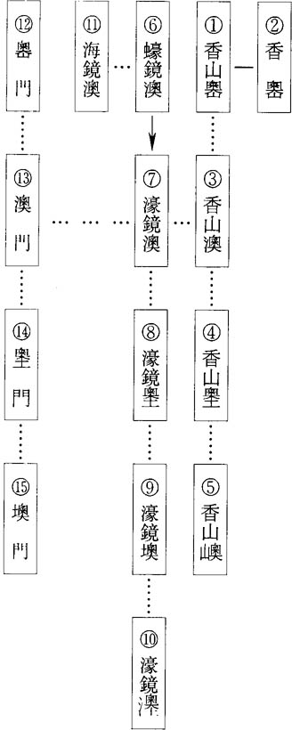 稱謂圖中實線框者均爲澳氹路地名稱謂,虛線框者爲演變過程中的某些名稱。稱謂之間有實線箭頭者,表示有傳承關係,有虛線者則表示可能有某些演變關係。