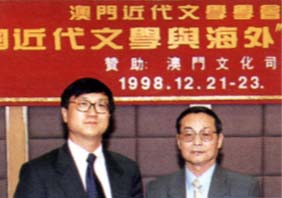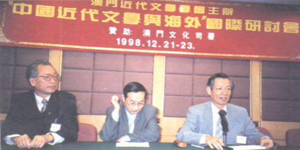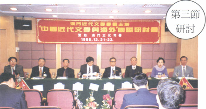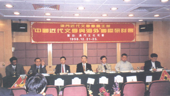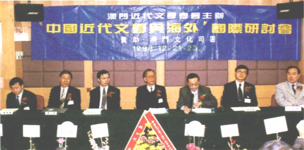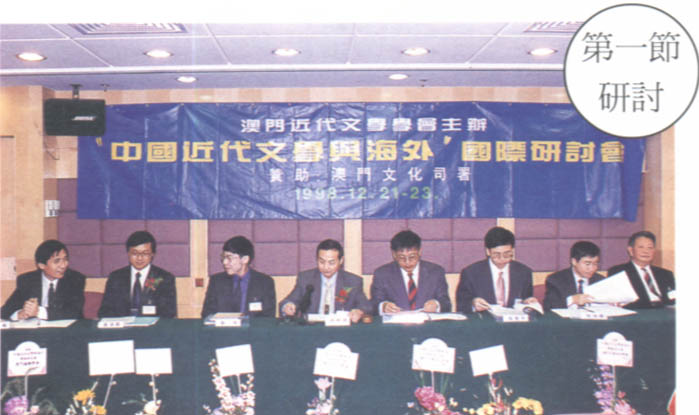 開幕典禮上,主禮台上嘉賓合攝。(右)起:本會顧問程祥徽敎授,韓國吳淳邦敎授、中國近代文學學會會長郭延禮敎授、本會會長鄧景濱博士、澳門新華社宣教文體部副處長羅先友先生生、中國管林敎授、香港黃坤堯博士