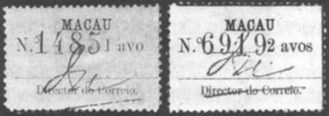在1911年8月2日的澳門政府憲報所頒佈的第168號訓令,批准發行“局長簽字郵票”。面値分1仙及2仙兩種。訓令中還聲明此項郵票祇限貼用於投寄本澳,香港及中國之郵件上。