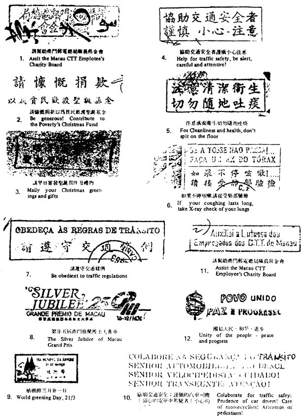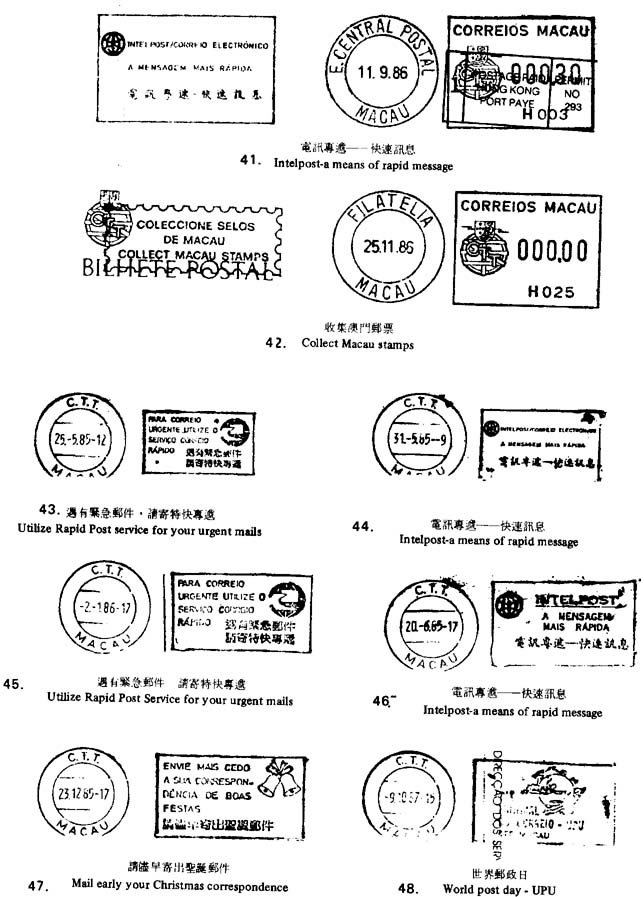 E.到達宣傳戳,顏色全是黑色。自從1954年開始使用第1枚機械到達戳之後,便一直沿用至今,祇是戳形稍作改變而已,且曾在一些日子裡,加上宣傳字句,(如圖(43),(43)的兩枚,因字體細小,未能清楚表達內容,結果祇用了約20天便告停用,改以(45)(46)兩戳代替。前者因使用時間極短,故留下來的宣傳戳不多。圖(47)(48)除有見於作到達戳使用外,亦有出現於銷票的本澳實寄封上。)