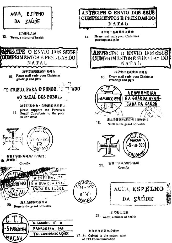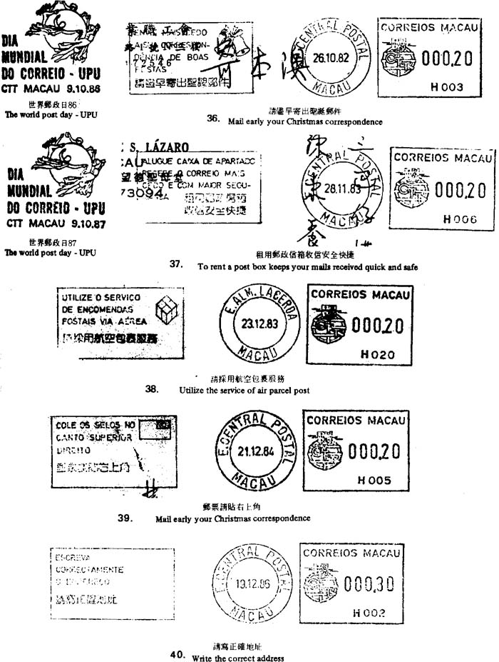 D.郵資機宣傳戳(圖36至42),顏色全是紅色。本澳郵局多年前已開始使用郵資機,方便投寄大量郵件。而且在某些日子裡更會加上宣傳字句,配合推廣郵局某些部門的運作或服務。