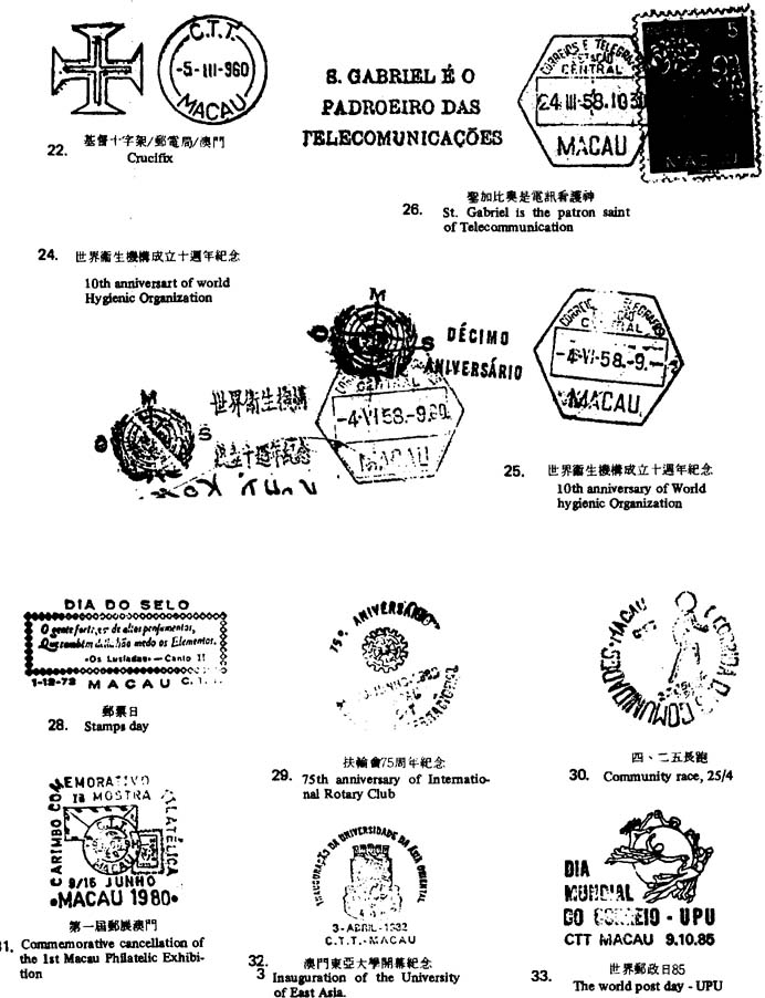 澳門於1884年3月1日正成立了郵政局,曾經發行的郵票種類有:普通票、紀念票、航空票、欠資票及特別臨時郵票。而使用過的郵戳,超過100多種,包括有普通郵戳、郵政分局及代辦站郵戳、紀念戳、首日戳、軍郵戮、機械戳、宣傳戳等等。