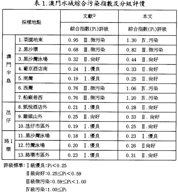 如果仍用上述的調查資料,剔除總鉻和砷兩項後,仍用指數叠加法進行評價,比較結果在表1中列出⑤這樣澳門水域環境污染程度就顯得較重,澳門半島的1.菜園地東,6.西灣和7.船廠巷西等都由“微污染”降爲“污染”;而4.葡京酒店南和5.南灣等則由“優良”降爲“尙好”,可能這樣的評價與澳門水域的現狀比較符合。