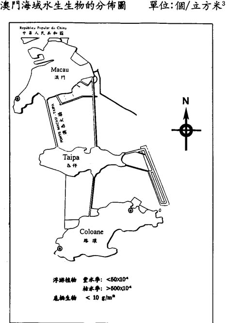 在豐水季節,澳門附近海域浮游植物生物量低於50×104個,遠比枯水季節的生物量低,且明顯低於澳門周圍海域。豐水季節澳門水域雖然有機物數量多,但濃度並不很高,特別是浮游植物生長所必需的有機磷含量很低,祇有0.002mg/L,僅爲水質標準值的十五分之一,限制了浮游植物的生長。同時,由於泥沙含量很高,水體混濁,水體透明度祇有五十厘米左右,太陽光爲泥沙所反射和阻隔,浮游植物祇能在表層生長。但在澳門周圍的內伶仃島周圍水域,由於泥沙含量少,浮游植物祇能在表層生長。但在澳門周圍的內伶仃島周圍水域,由於泥沙含量少,浮游植物密度比澳門水域高出四倍。在桂山島和萬山群島附近海區,由於泥沙甚少而有機質豐富,浮游植物生物量更高出澳門水域十倍以上,衆多的海生動物食物充足,大量生長繁殖,形成著名的萬山漁場。在豐水季節,浮游植物優勢種以浮游廣布種骨條藻、海毛藻、柔弱菱形藻爲主。