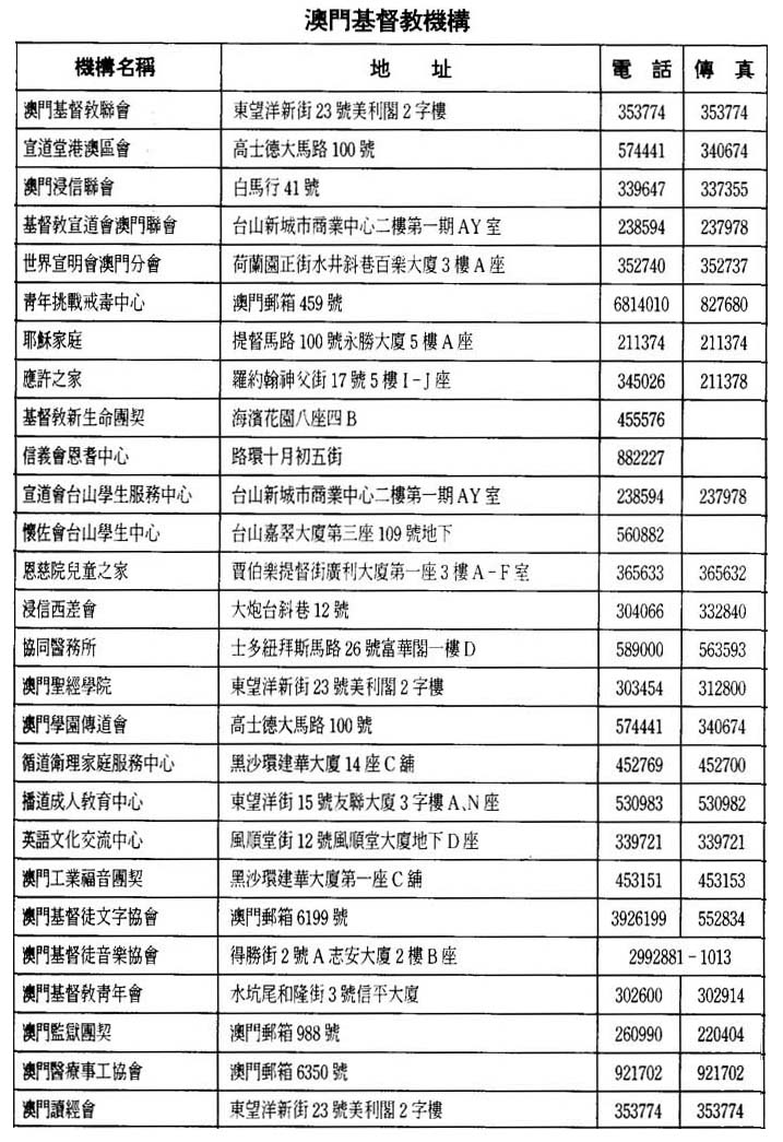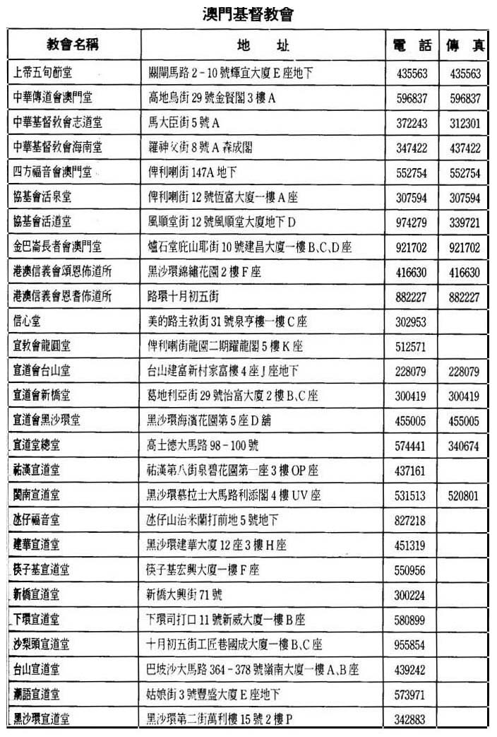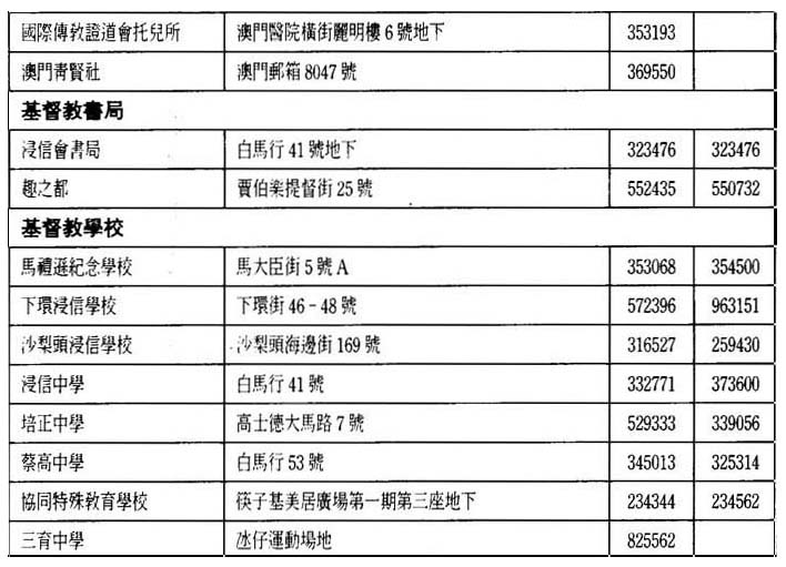 本澳大約有數萬名基督徒。其中包括神召會(主要工作是幫助癮君子重獲新生)、浸信會、路德會、聖公會及中華基督敎會等,本澳目前有九所由基督敎會開辦的學校。