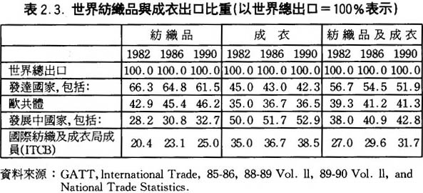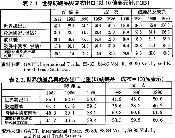 一向以來,在世界的成衣及紡織品貿易中,紡織品貿易佔的比重高於成衣貿易,早在第一屆MFA簽訂的第一年——1974年,在世界成衣紡織品貿易中,紡織品業的貿易額是280億美元,兩倍大於成衣業的貿易額,自此之後,成衣業的貿易不斷擴大,其發展速度,以高於紡織業的速度增長;到1990年,成衣業貿易額終於和紡織的貿易額拉平,各爲1,040億美元(詳見表2.1.)。所佔的比重雖然各佔一半,但在發達國家與發展中國家中,成衣和紡織所佔的比重是恰好相反的(詳見表2.2.)。