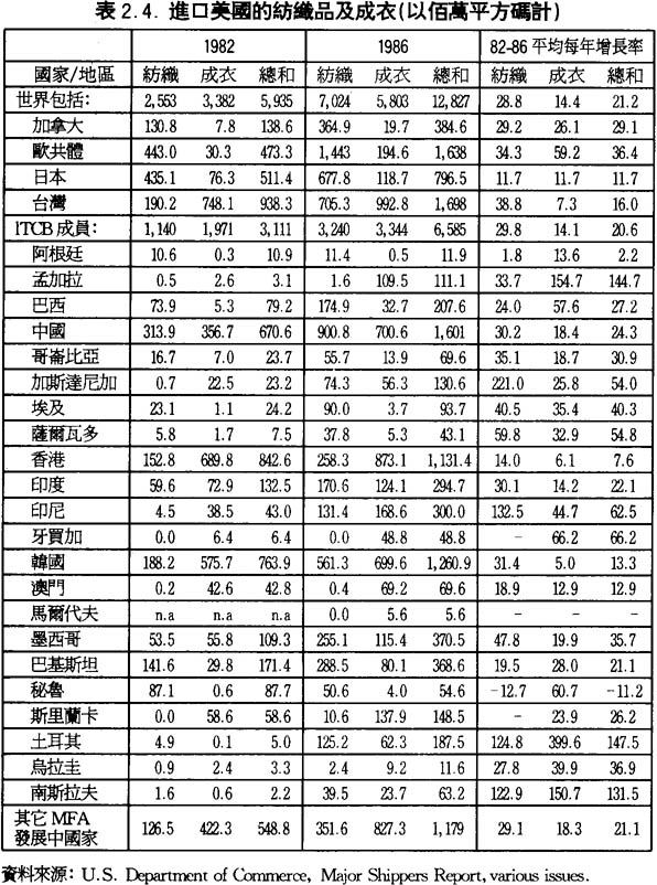 1982年至1990年期間,發展中國家的進口成衣及紡織品都有所增長,由1982年的220億美元上升到1990年的400億美元,增長了81.8%,年增長率爲7.8%(詳見表2.13.)。在這400億美元的進口中,大約有四分之三的貨值是紡織品進口,其餘100億的貨值才是成衣。從中可以觀察到進口紡織品的比例比成衣要高,而其中一個主要原因是很多發展中國家也是成衣出口國,因此需要進口製造成衣原材料,使進口紡織品的比例大過成衣。進口成衣及紡織品的發展中國家大致可分爲兩大類,一爲凈出口國,指一些出口成衣及紡織品貨值大於入口該類產品貨值的國家;二爲凈入口國,是指入口貨值大於出口貨值的國家。早在1982年凈入口國的入口成衣及紡織品貨值是高於凈出口國的,但到了1990年情况剛好相反,凈出口國進口成衣及紡織品的增速遠高於凈入口國,凈出口國在這八年間增長了130%,年增長達11%;而凈入口國在這期間只增長了41.7%,年增長率爲4.5%。凈出口國在這期間紡織品貨值增長比凈入口國快,主要是因爲凈出口國在這個階段裡對於製造成衣的原材料需求增加所致。