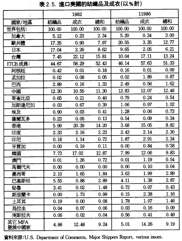 另一方面,在第一階段出口成衣及紡織品往美國有強大增長的國家不一定佔美國內部市場有大的比重。例如,年增長率最強的國家土耳其,在1986年只佔美國成衣及紡織品內部市場的1.46%,這就意味着,這些有強大增長的國家,它們初時出口到美國的數量少,因此發展潛力較大,而做成出口數量的增加會直接反映在出口的增長率上。事實上,1986年美國的成衣和紡織品入口市場佔百分比超過5%的國家和地區,大部份比1982年所佔的比例有所降低。例如台灣,由1982年的15.8%下降到1986年的13.2%;香港由1982年的14.2%下降到1986年的8.8%;南韓由1982年的12.9%下降到1986年的9.8%;日本由1982年的8.6%下降到1986年的6.2%。而上升的國家或組織只有兩個,一爲歐洲共同體,由1982年的8%上升到1986年的12.8%;二爲中國,由1982年的11.3%上升到1986年的12.5%。反觀其他發展中國家,雖然它們在美國的入口市場中所佔的比重都比較小,都低於3%,但是對比起1982年的比重差不多全部有所增加(詳見表2.5.)。由此,我們可以觀察到佔比重大的國家,它們大部份在1986年所佔的比重都比1982年所佔的高。這意味着,進口美國的成衣紡織品逐漸由一些市場佔有率高的國家轉移到一些佔有率低的國家,這個趨勢也是十分明顯的。