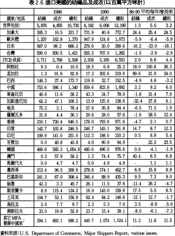世界的成衣及紡織品貿易的增長在1986年到1990年的這個階段明顯地放緩。1990年由於美國國內的需求減弱以及強化進口的限制,導致入口增長更加乏力。日本進口成衣及紡織品的貿易,1990年下降了4%,而前景也不太樂觀。