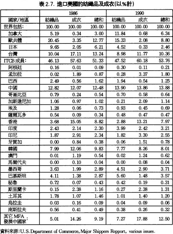 另一方面,出口各國佔美國成衣及紡織品入口市場的比重也與第一階段的趨勢相同,即是說,在美國入口成衣及紡織品市場佔有率較大的國家繼續在第二階段降低其故有的佔有率,相反,佔美國市場微不足道的國家的佔有率則在第二階段繼續上升,使美國市場的分佈更加平均。現在就來看各國的分佈情况。首先,在1986年佔美國內部成衣及紡織品市場超過5%的國家其市場佔率均在1990年下降,祇有一個國家例外,這就是中國,由1986年的l2.5%上升到1990年的13.9%,其餘的5個國家和地區都在下降,歐洲共同體由1986年的12.8%下降到1990年8.8%;台灣由1986年的13.2%下降到1990年的10.4%;南韓由1986年的9.8%下降到1990年的8%;香港由1986年的8.8%下降到1990年的8%;而其它小於5%的國家在美國成衣及紡織品的市場佔有率基本上都增加,而只有個別八個國家在下降,這八個國家分別爲巴西、埃及、巴基斯坦、秘魯、烏拉圭、南斯拉夫、羅馬尼亞和泰國(詳見表2.7.)。而其它低於5%佔有率的國家都比1986年的佔有率上升,這樣的走勢使美國的市場分佈更加平均,競爭更加激烈。