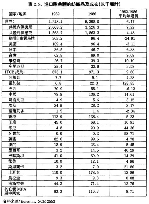 在這時期歐洲共同體的成員比第二階段多出兩個國家(西班牙和葡萄牙),第二階段的共同體市場比第一階段也擴大了,在增長幅度上提供了一定潛力。事實上,在這個階段,歐洲共同體進口成衣及紡織品的增長幅度比第一階段高,在整個進口量來看,第二階段的年增長爲7.1%,比第一階段的6.2%爲高。這階段,來自共同體以外的進口增長比來自共同體以內的爲高,剛好同第一階段相反。這時,來自共同體以外的年增長爲11.3%,來自共同體以內的年增長爲4.7%。例如,歐洲自由貿易體(EFTA)由第一階段的-24.9%上升到第二階段的33.4%,美國由第一階段的-3.1%上升到第二階段的15.9%,巴西由第一階段的-6.1%上升到第二階段的6.6%,新加坡由第一階段的-11.1%上升到第二階段的24%。(詳見表2.10.)這階段的年增長比第一階段大的原因主要有三個: