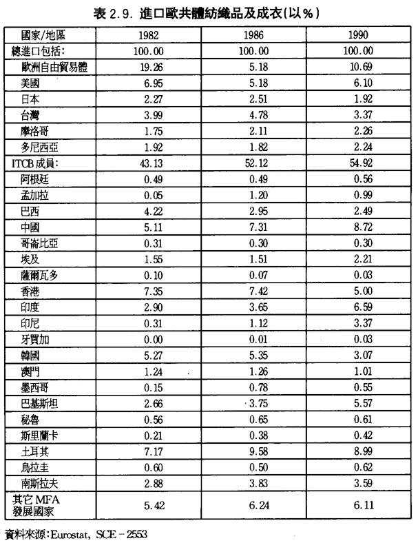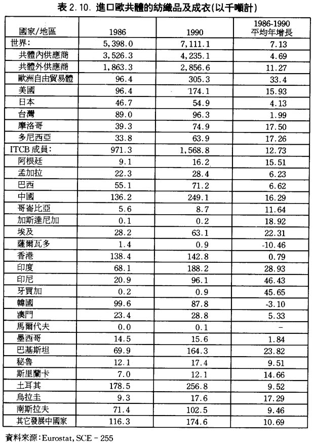 一直以來,歐洲共同體的成衣紡織品進口市場主要由共同體內的供應商所控制,1986年來自共同體內供應商的成衣及紡織品佔共同體進出口市場的65.3%,外部市場所佔的比重則爲34.5%,競爭性非常之大。在1986年,共同體以外的供應商差不多都是發展中國家,而比重較大的國家和地區分別爲土耳其9.6%,香港7.4%,中國7.3%,南韓5.4%,美國5.2%和歐洲自由貿易體5.2%(詳見表2.9.)。