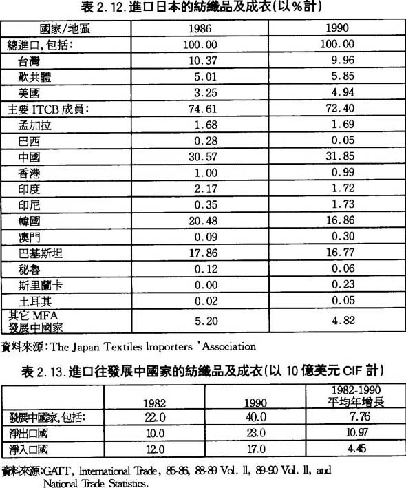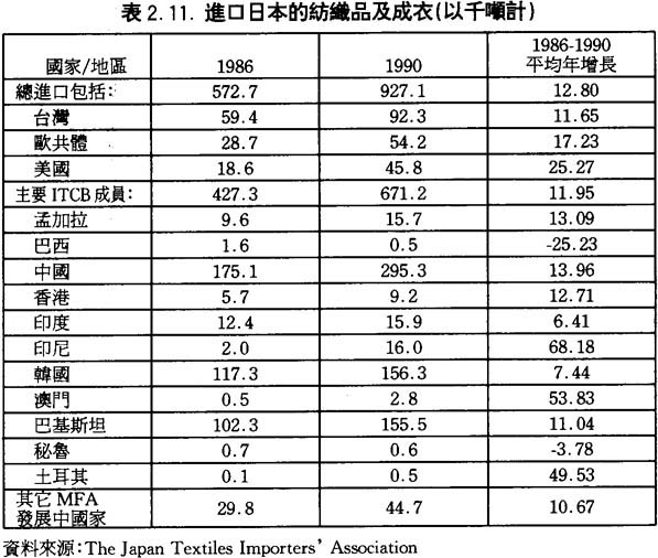 另一方面,很明顯日本的成衣及紡織品主要供應商只有數個國家,1990年,分別是:中國佔日本進口市場的31.9%,南韓佔16.9%,美國爲4.9%,泰國佔3.7%(詳見表2.12.)。這樣看來日本的成衣及紡織品進口市場被少數國家所壟斷,其它國家所佔的比重極小。