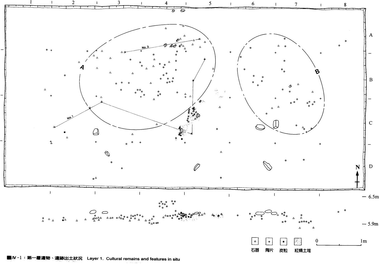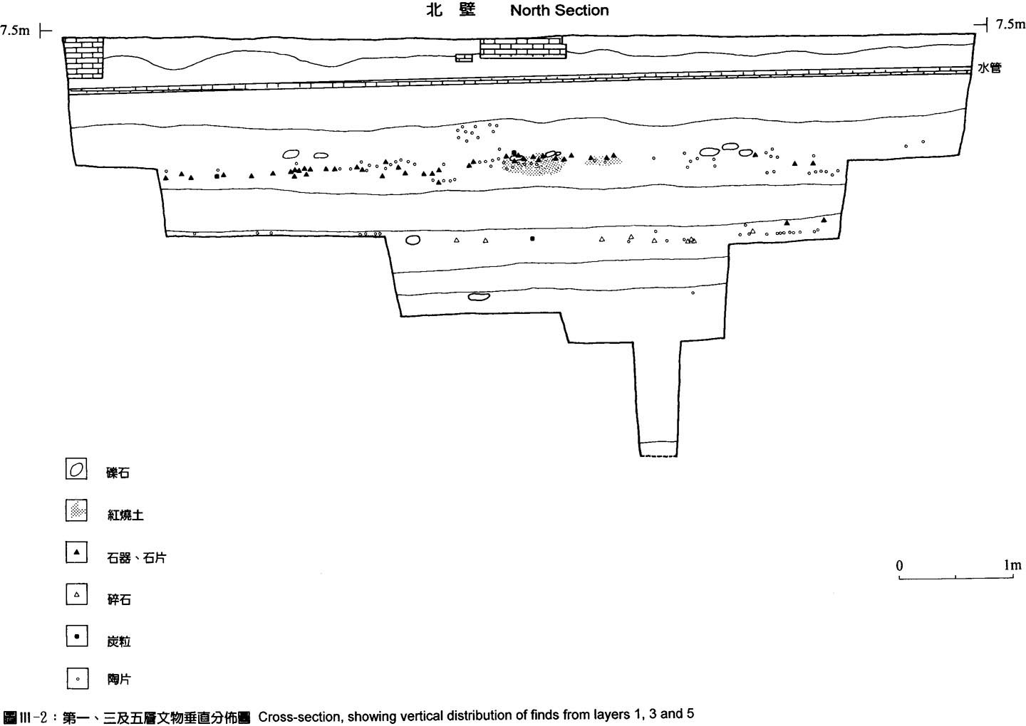 4.第三層:Hue 7.5YR 7/8,厚30-37 cm,沙質土,較第一層色調稍暗。本層出土若干陶片,石器較分散。從出土遺物平面及垂直分佈觀察,本層的生活面較稀薄。